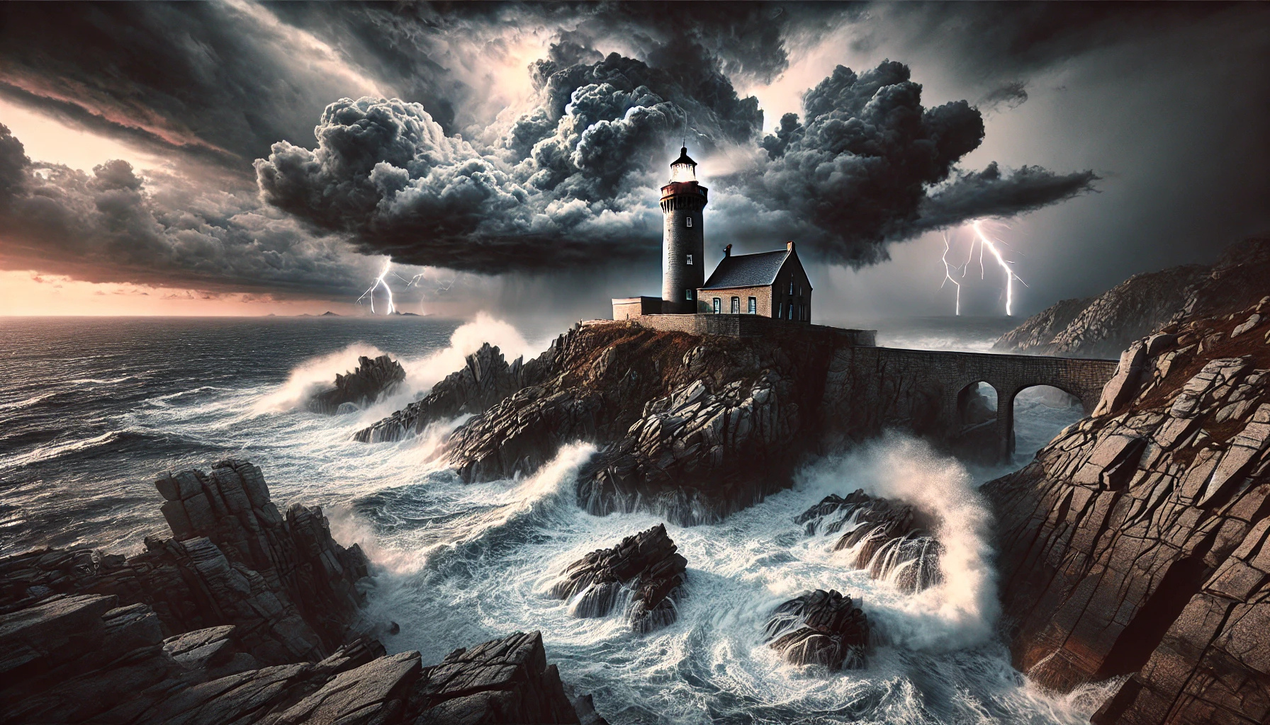 Stormy Lighthouse: A weathered lighthouse perched on a jagged cliff overlooking a turbulent sea. Dark storm clouds swirl above, and lightning illuminates the scene as waves crash violently against the rocks.